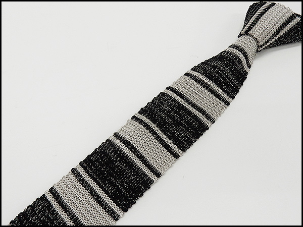 ニットタイ ネクタイ 剣先6cm シルク100% 黒×銀 ボーダー 霜降り ntt111