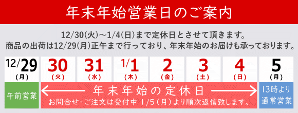 | 【配送に関しての重要なお知らせ】 年末年始による物流の増加に伴い商品の入出荷や配送等に遅れが出ております。 |