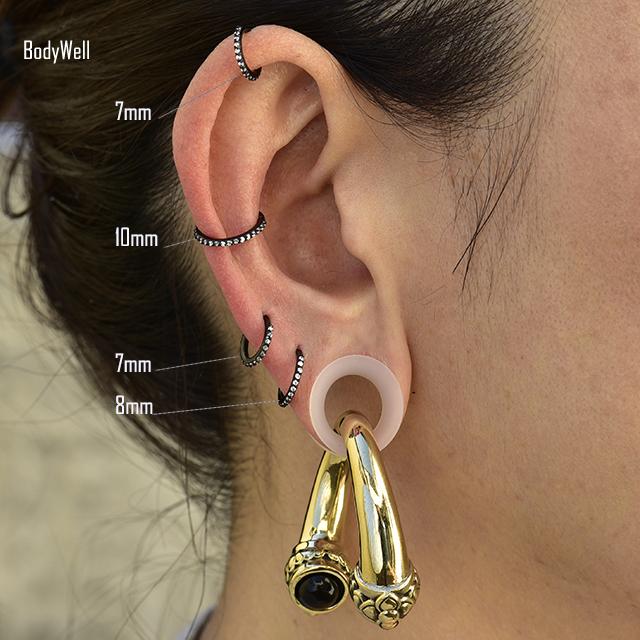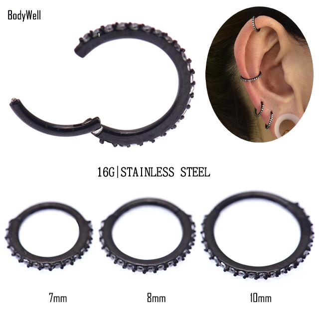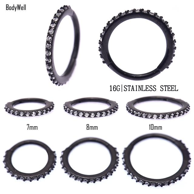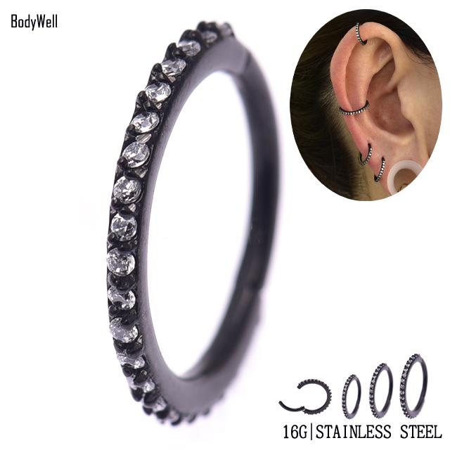 ボディピアス ワンタッチで簡単 16G 選べる内径サイズ ストーン ブラック クリッカーピアス ロブ へリックス セプタム ブラックリングピアス