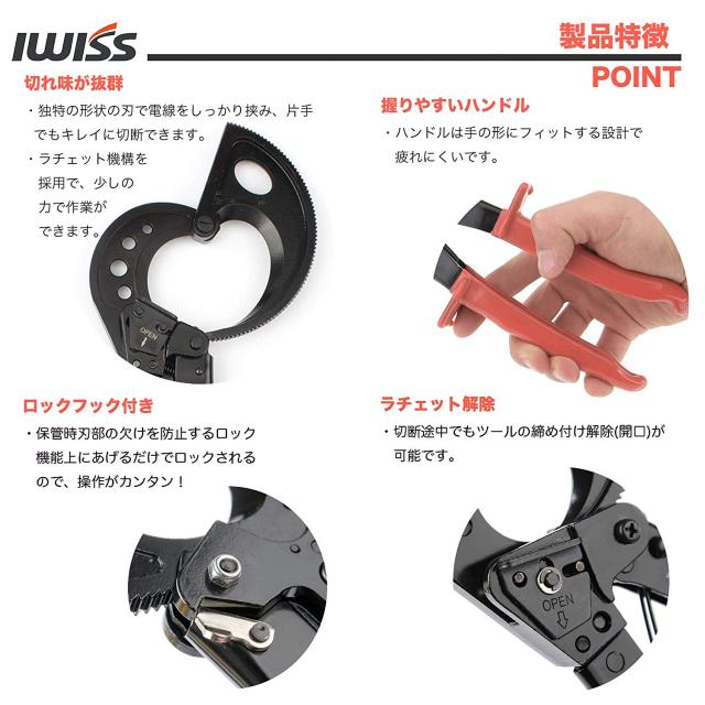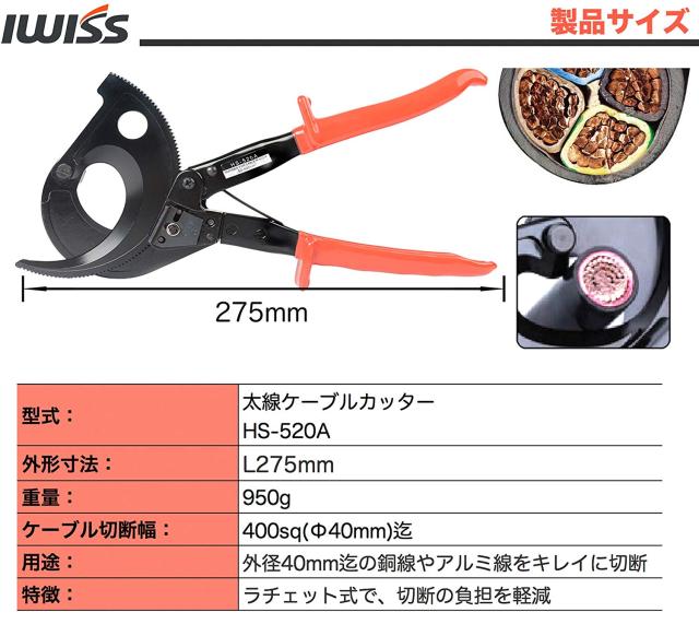 アイウィス IWISS ケーブルカッター 太線 ラチェット 電線サイズ400sq迄 ケーブル 太物ケーブルカッター 切断工具 切断 太物 ストリッパー ワイヤーカッター 単線 ヨリ線 アルミ線 複合線 銅線 電工 配線 修理 DIY HS-520A