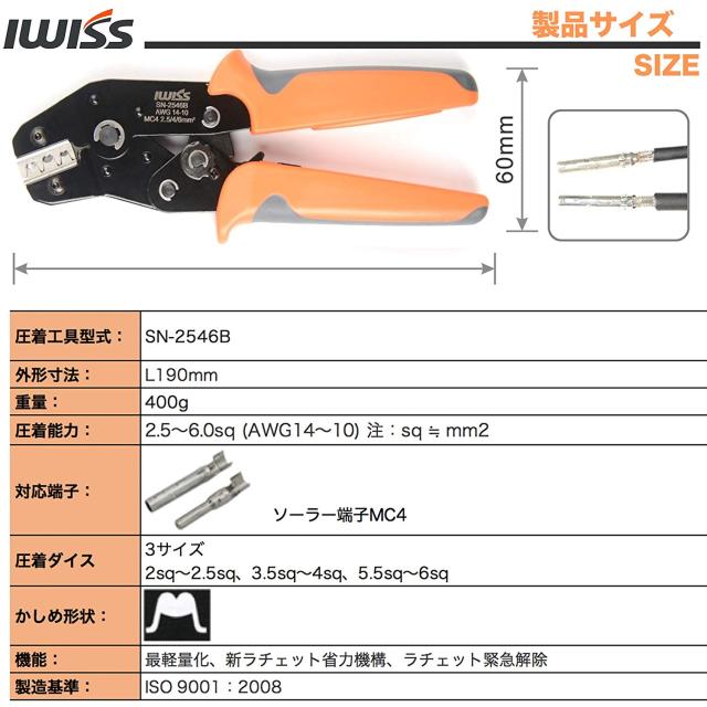 IWISS 太陽光 ソーラーパネル MC4コネクタ 軽量ペンチ EDM加工ダイス 圧着 工具 2.5-6.0mm2 SN-2546B