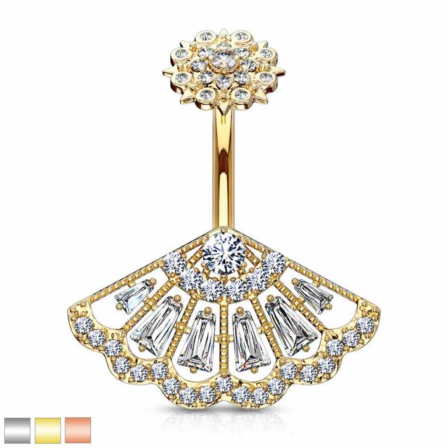 [14G 臍ピアス ボディピアス]CZステンドグラスパベ へそピアス 14G インターナル 14ゲージ サージカルステンレス316L製 メンズ レディース ゴールド ピンクゴールド 内ネジ 逆ネジ 長い 扇型 扇子 花 フラワー ボディーピアス プレゼント ヘソピアス ジルコニア クリスタル