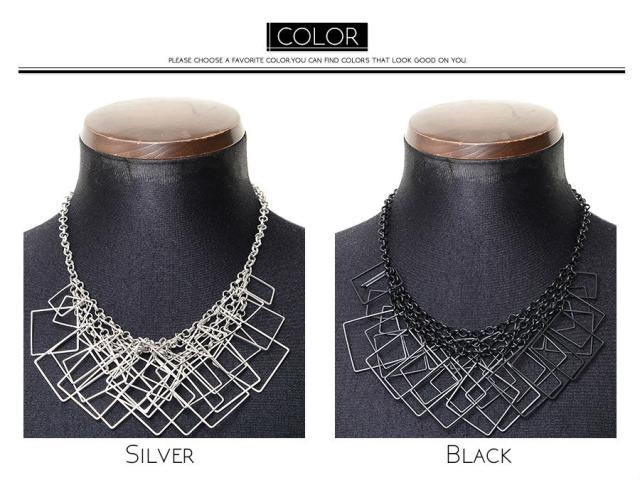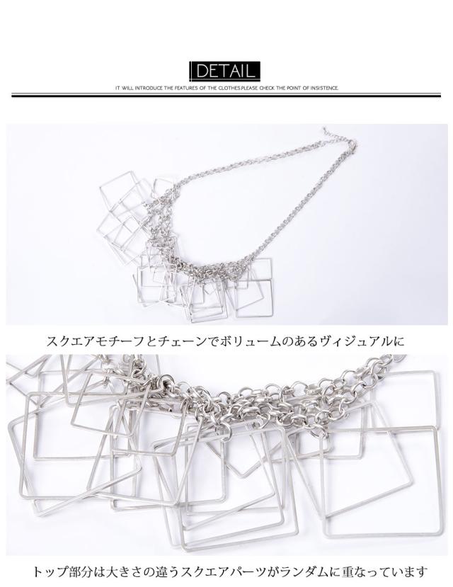 大小大きさの違うスクエアモチーフが重なりあい胸元を華やかにボリュームのあるヴィジュアルに。