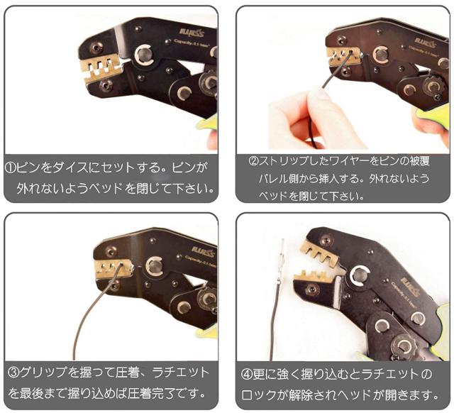 圧着ダイスは0.5-1m?、1.5-3.5m?、4-6m?の3サイズがあります。以下通りに圧着してみました