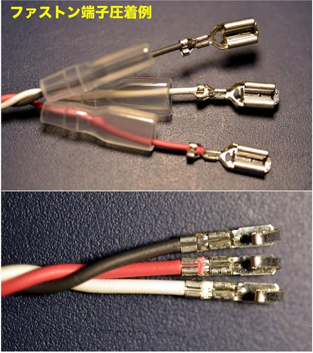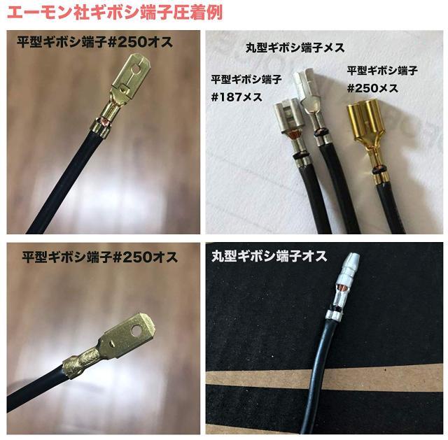 平形ギボシ端子(オス)と丸型ギボシ(オス)を1.5-3.5m?を使用しました(下側の写真)。