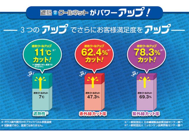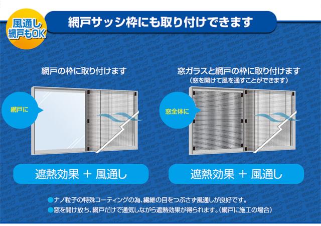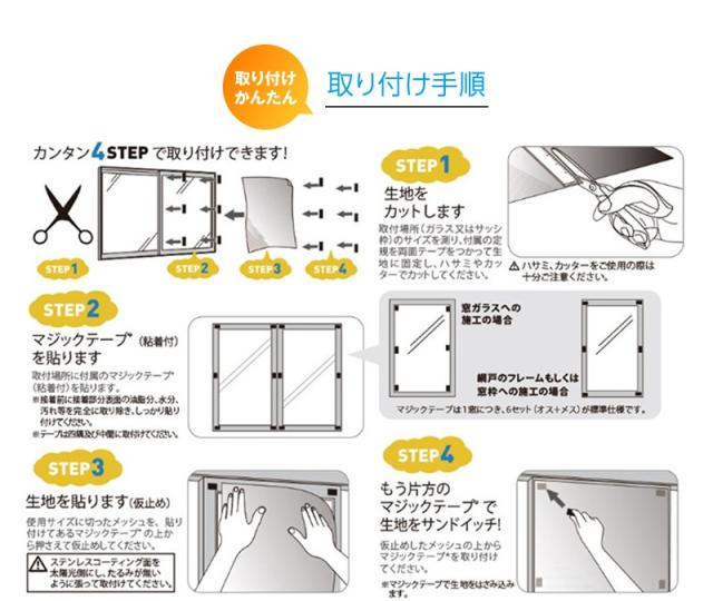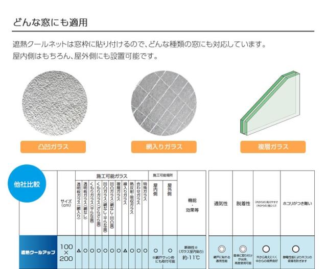 取付カンタン!お部屋快適 遮熱クールアップ。遮熱クールネットがバージョンアップ。マジックテープで窓に簡単に貼れる! (取り外し自由)紫外線をカットし、室内の温度上昇・家具やお肌の日焼けから守ります。ナノ粒子の特殊コーティングのため、繊維の目をつぶさず風通しが良く、日中は外から室内が見えにくくプライバシーの保護にも !(目隠し効果)ガラス面にも窓サッシ枠にも網戸にも取付けできます。【材質】ポリエステル100% (ステンレス加工)【サイズ】100×200cm(1枚あたり)【セット内容】本体(100×200cm)×4枚、紙製定規、マジックテープ×48ケ、取扱説明書【対応ガラス】凹凸ガラス、網入りガラス、単層ガラス、複層ガラス【製造国】日本