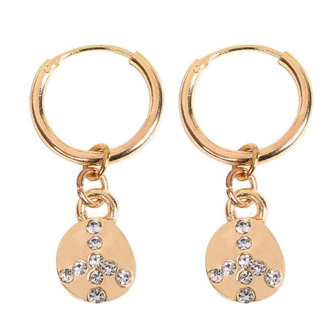 金色のシンプルなリングピアスに平和のシンボルピースマークを丸型のプレートにクリスタルのラインストーンでデザインしたチャームをセットしたゴールドリングピアス。