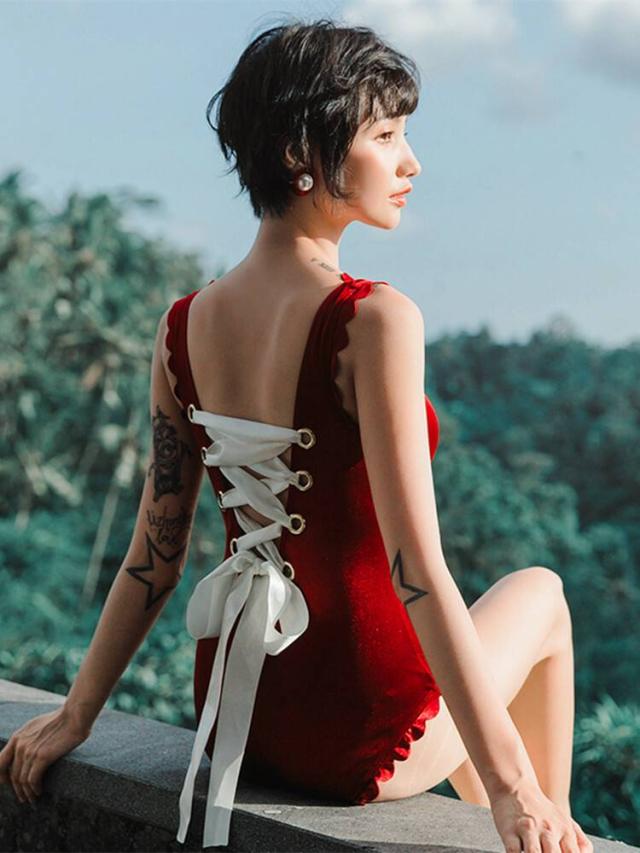 体型カバー 水着 ワンピース 大きいサイズ レディース 2019年新作 ワンピース水着 ビーチウェア 40代 30代 ベロア レースアップ フリル オールインワン リボン 無地 シンプル 着やせ カバーアップ 韓国 ママ オシャレ XL プール リゾート レッド ピンク