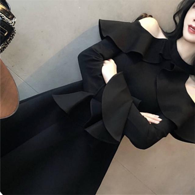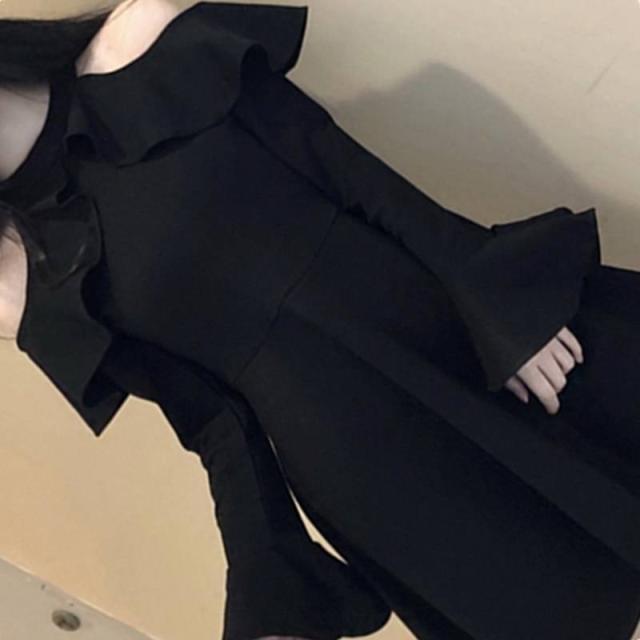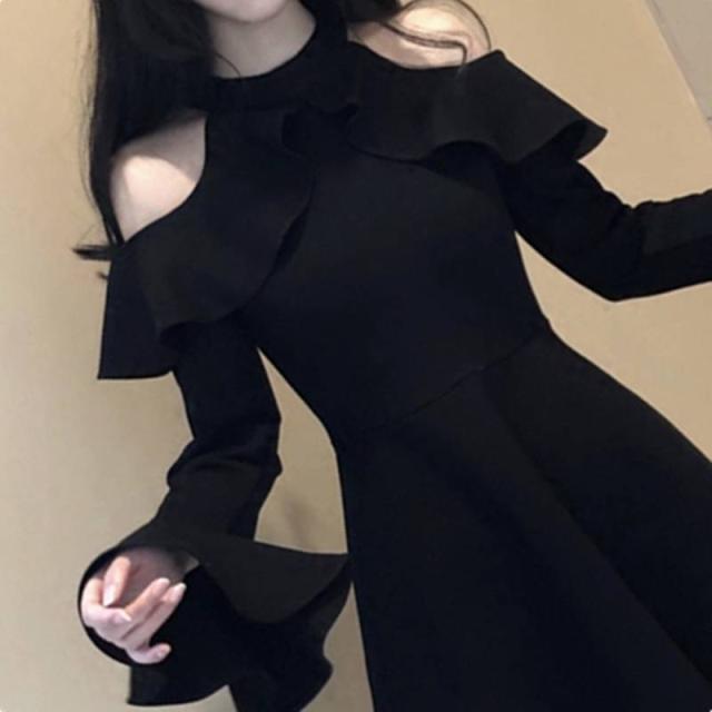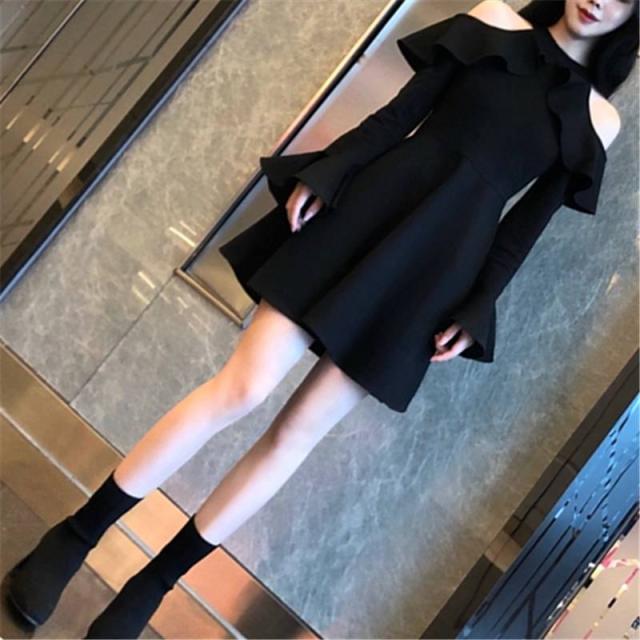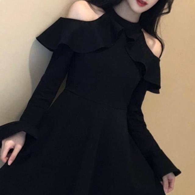 パーティードレス ミニワンピース 可愛い 春 オフショルダー オープンショルダー ホルターネック フリル 長袖 ベルスリーブ フレア ミニ丈 大人 おしゃれ フェミニン エレガント 韓国ファッション 無地 レディース パーティー 結婚式 二次会 お呼ばれ フォーマル