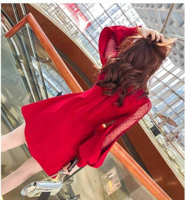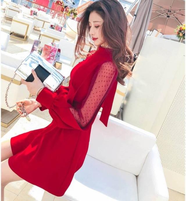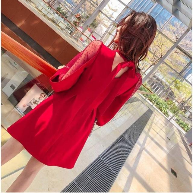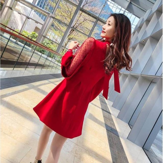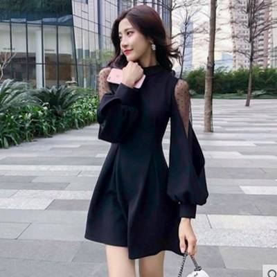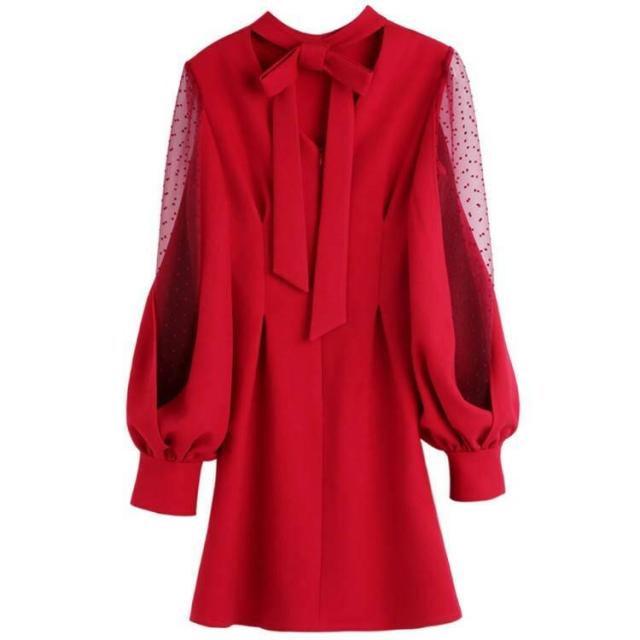 エレガントワンピース 春 長袖 バックリボン ビショップスリーブ バルーンスリーブ ボリューム袖 シースルー セクシー ハイネック フレア Aライン ミニ丈 ショート 大人 上品 ドレス おしゃれ フェミニン 韓国ファッション レディース パーティー 結婚式 二次会 お呼ばれ
