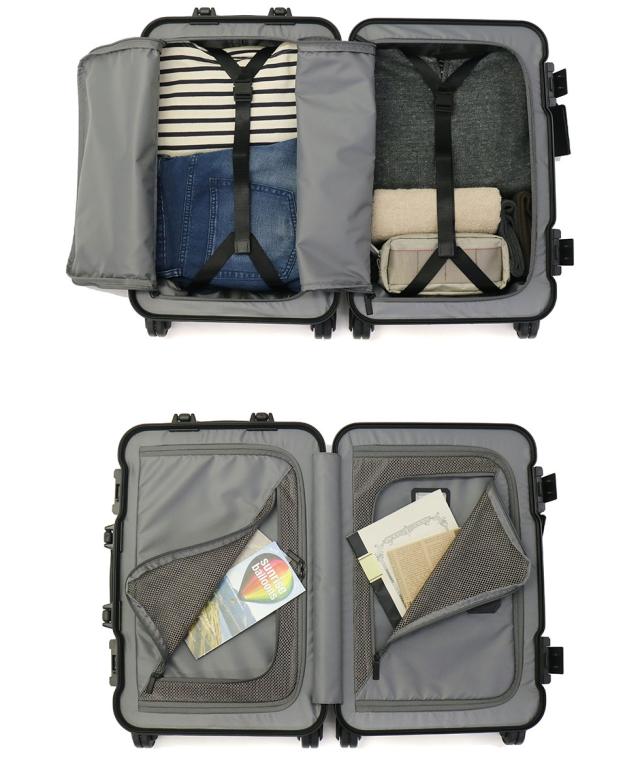 内装には両面にジップ開閉による収納部を装備、内部にクロスベルトも設けていますので荷崩れの心配もありません。また、お手持ちのハンガーが掛けられるフックが設けられており、出張などでスーツやジャケットを持ち運ぶ際に配慮された気配りのある設計も魅力の一つです。