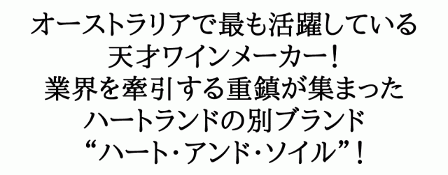 オーストラリアワイン愛好家、シラーズファン大注目!ワインとは“オーストラリアの青い空、輝く太陽、歴史ある大地を真に表現するものである”という信念で、オーストラリアで最も活躍している天才ワインメーカー!ワイン造りに情熱を注ぐ若き天才醸造家ベン・グレッツァー氏をはじめ、ベンの叔父で元ウルフブラスのチーフワインメーカーであるジョン・グレッツァー氏他、業界を牽引する重鎮が集まってワイン造りを行う南オーストラリアのラングホーン・クリークに位置するハートランドの別ブランド“ハート・アンド・ソイル”!ラングホーン・クリークの樹齢40年以上の厳選シラーズ100%!ブラックベリーにアニス、砕いた胡椒などの風味が混ざり合った複雑味のある香り。濃厚なフルーツの味わいに、滑らかなタンニンが感じられる余韻が長くバランスの取れた赤ワイン!さすが天才醸造家ベン・グレッツァーと大納得!飲み頃3年熟成が限定で少量入荷!