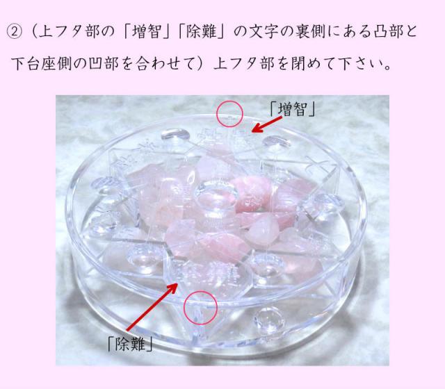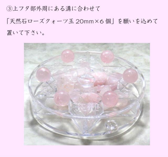 3.上フタ部外周にある溝に合わせて「天然石ローズクォーツ玉20mm×6個」を願いを込めて置いて下さい。