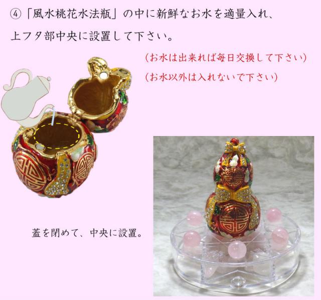 4.「風水桃花水法瓶」の中に新鮮なお水を適量入れ、上フタ部中央に設置して下さい。