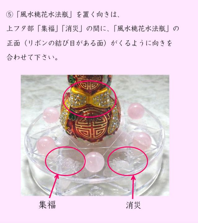 5.「風水桃花水法瓶」を置く向きは、上フタ部「集福」「消災」の間に、「風水桃花水法瓶」の正面(リボンの結び目がある面)がくるように向きを合わせて下さい。