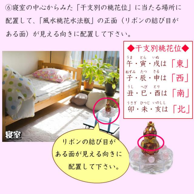 6.自室(部屋数が多い場合は寝室)の中心からみた「干支別の桃花位」に当たる場所に配置して、「風水桃花水法瓶」の正面(リボンの結び目がある面)が見える向きに配置して下さい。