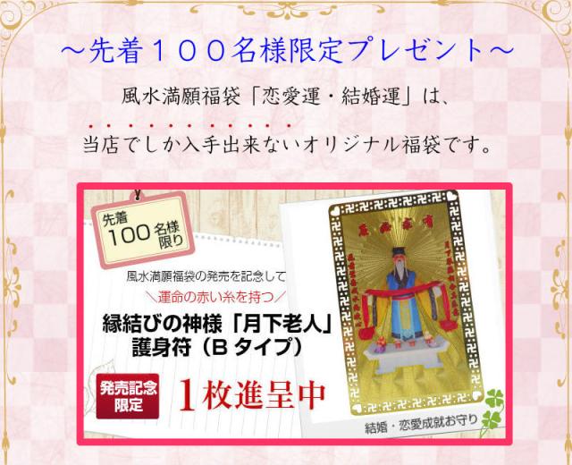 発売を記念して、先着100名様限定で、『運命の赤い糸を持つ縁結びの神様「月下老人」護身符(Bタイプ)』を一枚進呈中!