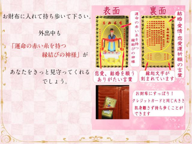 お財布に入れて持ち歩いて下さい。外出中も「運命の赤い糸を持つ縁結びの神様」があなたをきっと見守ってくれるでしょう。