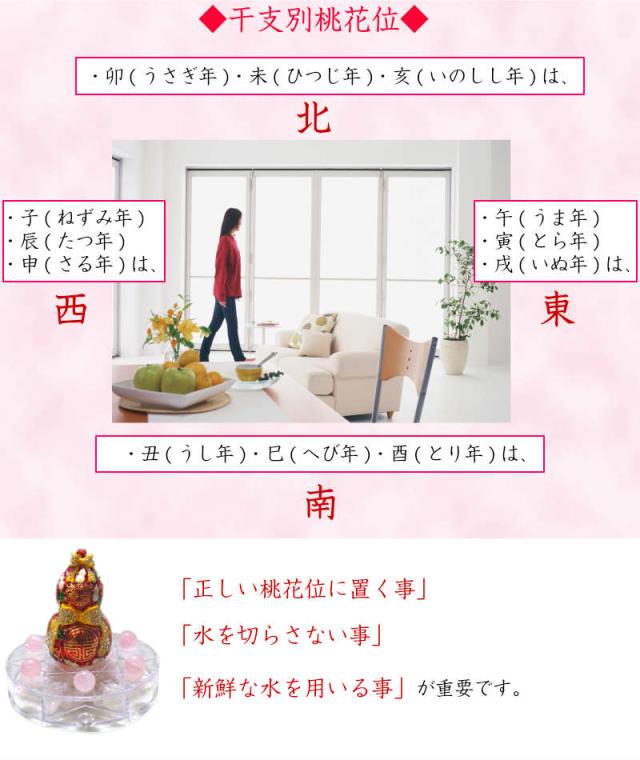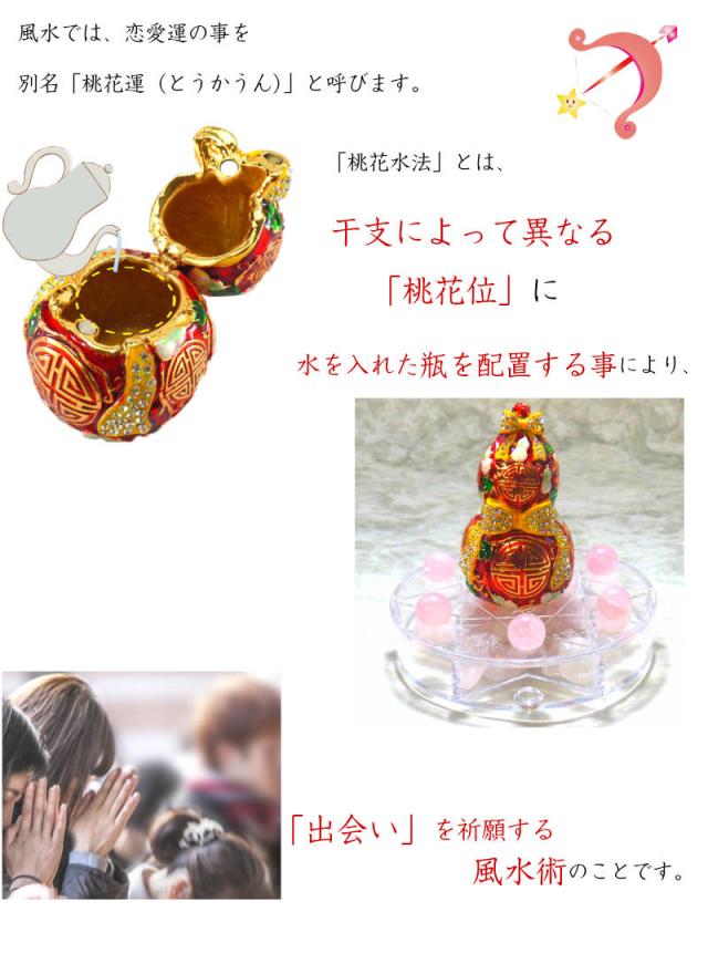 「桃花水法」とは、干支によって異なる「桃花位」に水を入れた瓶を配置する事により、「出会い」を祈願する風水術のことです。