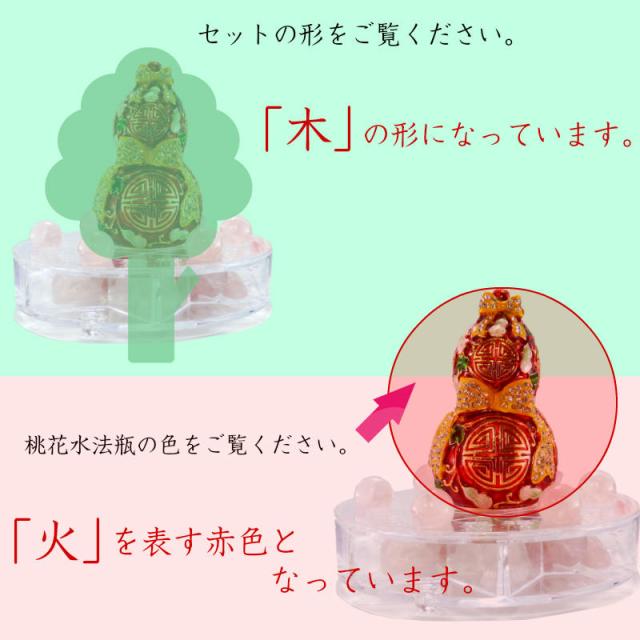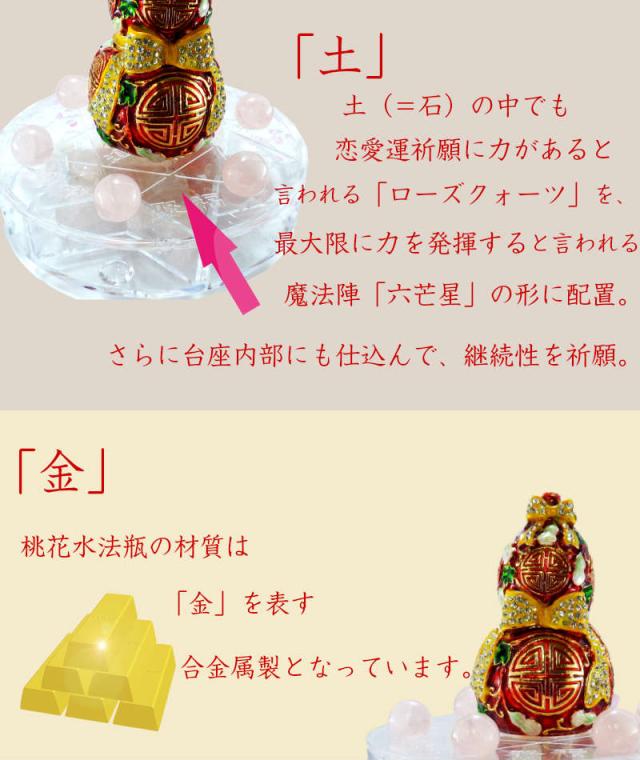 ・「土」—土(=石)の中でも恋愛運祈願に力があると言われる「ローズクォーツ」を、最大限に力を発揮すると言われる魔法陣「六芒星」の形に配置、さらに台座内部にも仕込んで、継続性を祈願。・「金」—桃花水法瓶の材質は「金」を表す合金属製となっています。