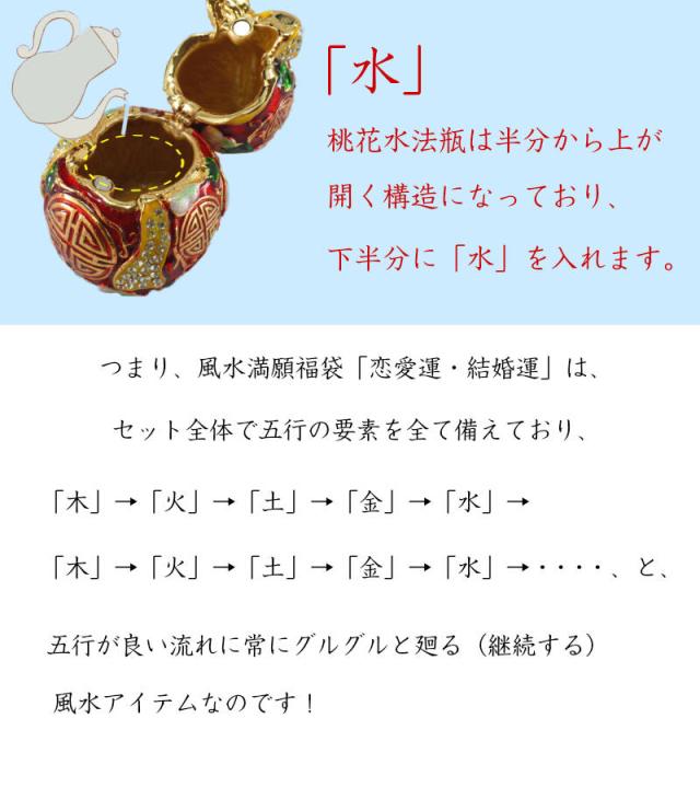 つまり、風水満願福袋「恋愛運・結婚運」は、セット全体で五行の要素を全て備えており、「木」→「火」→「土」→「金」→「水」→「木」→「火」→「土」→「金」→「水」→・・・・と、五行が良い流れに常にグルグルと廻る(継続する)風水アイテムなのです!