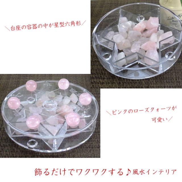1.「風水満願台座」の上フタ部を開き、願いを込めて恋愛運祈願の「ローズクォーツタンブル」を「風水満願台座」内部の「六芒星」の枠の中へ敷き詰めて下さい。