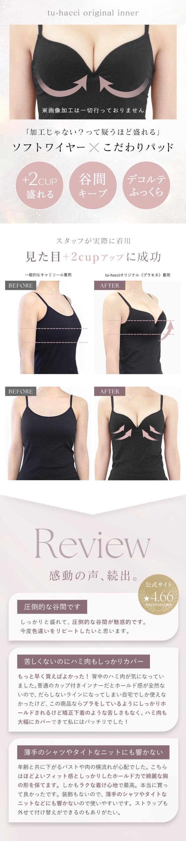 tu-hacciの人気No.1インナー。盛りブラ一体型キャミで、下着+インナーの重ね着のわずらわしさから解放。 インナーショップならではのノウハウを活かし、トップ位置は高く、美胸メイクを叶えるカップを独自に開発。 「盛りたい」「バストの形を綺麗に見せたい」方におすすめのシリーズです。 ■楽なのに綺麗なバストを叶える機能が満載。 【商品の特徴】 ・しっかり盛れるモチモチパッド搭載で着るだけで+2カップ ・インナーにブラの機能をそのまま取り付けているので『ズレない』『垂れない』 ・コンフォートな着心地にこだわり、食い込みを軽減するソフトワイヤーを搭載 ■「らくちん綺麗」だから、日中からおうち時間まで幅広いシーンで活躍 【こんな方におすすめ】 ・バストのボリュームが少ない ・バストの下垂や型崩れにお悩みの方 ・いかにもインナーっぽいデザインが苦手 ・バレずにバストを大きく見せたい ・大きいサイズのカップ付きインナーが欲しい 【こんな時におすすめ】 ・普段のインナーとして ・コーディネートに取り入れて ・おうち時間でのリラックスウェアとして ■3タイプからお選びいただけます ・リブレース ・リブタンクトップ ・総レース ■タイプによるサイズ感の違いについて このページで販売している3タイプは、内側のアンダーゴムの寸法は同じですが、 外側の生地の寸法・伸縮・ホールド感が違うため着用感が異なります。 【リブレース…ノーマルタイプよりゆったりめ】 見せて着られるよう、肌に張りつかないゆったりめの着用感です。 細身の方や、しっかりとしたホールド感をお求めの方は、1サイズ下をお試しください。 また肩紐の長さを調整いただくと、ホールド力がアップします。 【リブタンクトップ…ノーマルタイプよりゆったりめ】 見せて着られるよう、肌に張りつかないゆったりめの着用感です。 細身の方や、しっかりとしたホールド感をお求めの方は、1サイズ下をお試しください。 【総レース…ノーマルタイプよりきつめ】 生地に伸縮性がなく、タイトなつくりです。ぴったりと着用したい方向け。 細身の方以外は1サイズ上をお試しください。 ※他のブラモネシリーズはこちら! | |