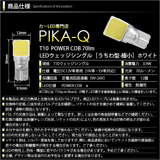| サイズ | COBサイズ:12mm×12mm/COB最大直径:12mm/高さ:30mm/ソケット幅:9.5mm ※T10白熱球サイズ 全長:27mm/最大直径:10mm/幅:9.5mm | |||