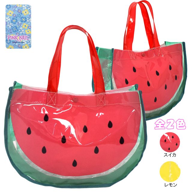 スイカの型にカットされた かわいい ビニールトート 。プール 海 温泉 などマチがあるのでタオルや水着、着替えなどもたっぷり入ります。上部にはワンボタン付きで中身が飛び出しずらくなっています。