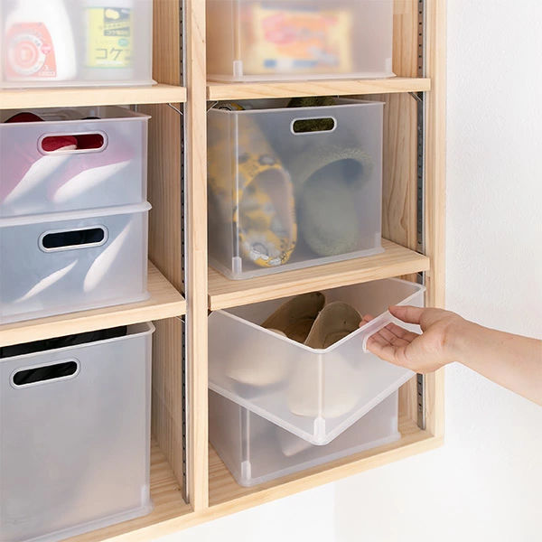 タオルや下着などの小物収納として、またキッチンで食品ストックの収納に便利なサイズです。無駄なスペースの少ない正方形は隅々まで使えて便利です。