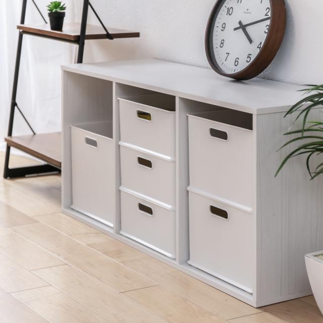3つ積み重ねれば、横置きしたカラーボックス1段にピッタリ収納が可能です。浅型サイズで、整理整頓しやすい大きさです。