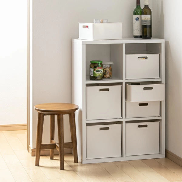 横置きしたカラーボックスにピッタリのサイズです。浅型サイズとスタッキングすれば、カラーボックス1段をフルに使えます。