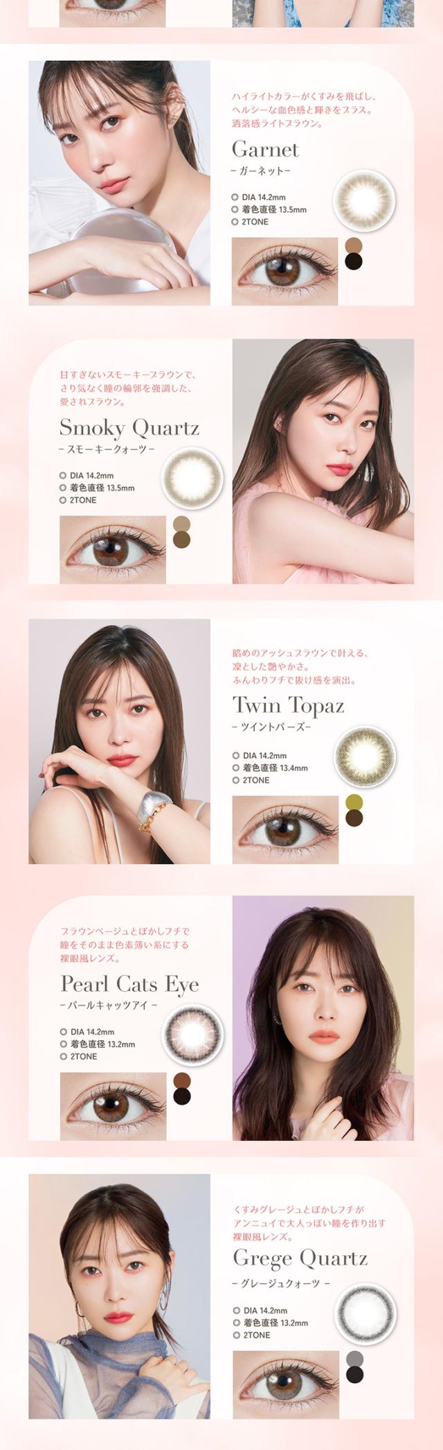 ■カラー:デートトパーズ、ストロベリークォーツ、オパール、パールキャッツアイ、グレージュクォーツ、ガーネット、スモーキークォーツ、ツイントパーズ、ルチルドロップ、クリスタルブルーム、グローブラウン、クリームローズ、モカリング、ココトパーズ、ラテパール、ベイビーエスプレッソ