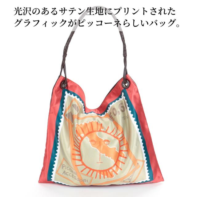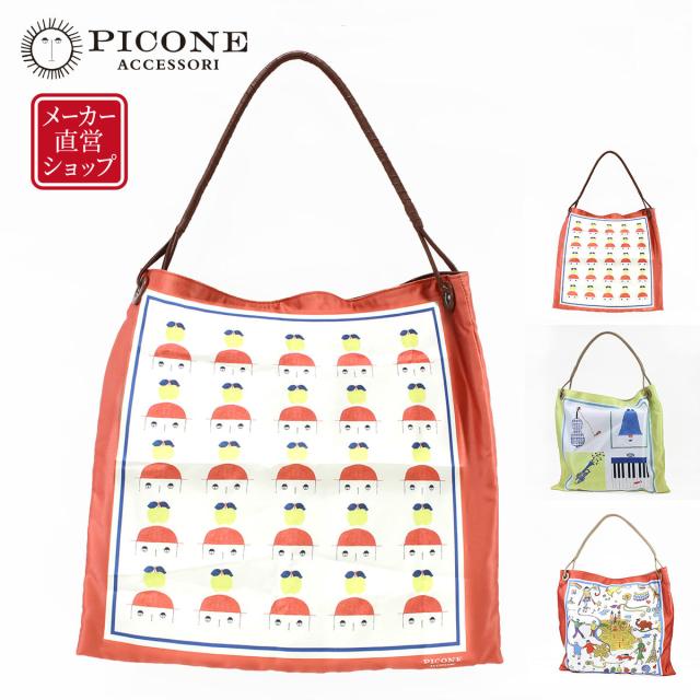 ピッコーネ アッチェッソーリ スカーフプリント 肩掛けバッグ ポリエステル製 レザー風ハンドル マチなし テロテロ素材 A4よりビッグ スクエア型