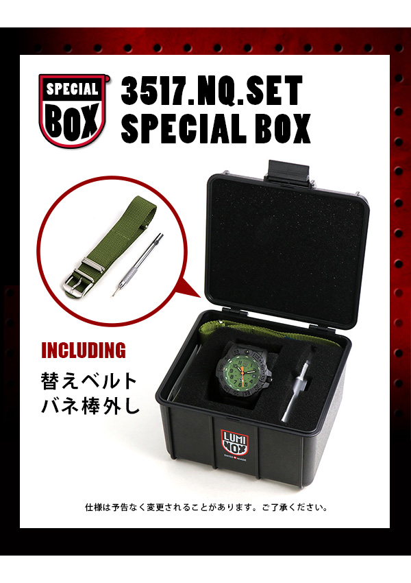 | 付属品 | スペシャルパッケージ 替えベルト付き(グリーン/NATOタイプ) ばね棒外し ※取扱説明書につきましては、メーカー公式ページよりご確認ください。 ※こちらの商品は並行品の為、ギャランティーカードは付属致しませんが、 当店にて一年間の保証をさせて頂きます。 |