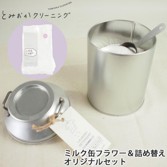 とみおかクリーニング オリジナル 洗濯洗剤 フラワーミルク缶&詰め替えセット ステンレス計量スプーン付き 粉末/ラベンダー/送料無料