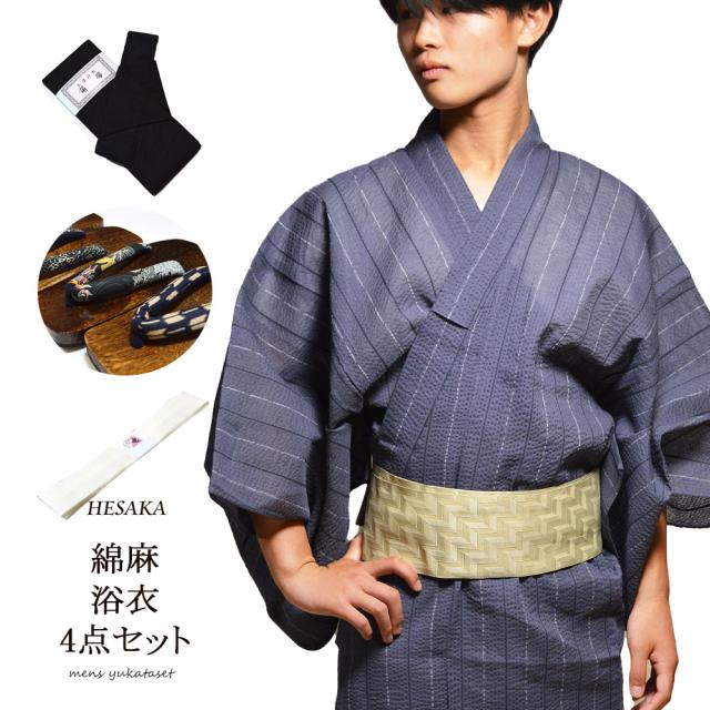 浴衣 メンズ 4点 セット 男性 ゆかた ( ワンタッチ角帯 下駄 腰紐 )
