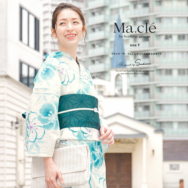 即納【レディース浴衣3点セット】浴衣セット/レディース/ベージュ/青緑/金魚/麻の葉/花/綿麻/女性/マクレ/ボヌールセゾン/フリー/大人/送料無料