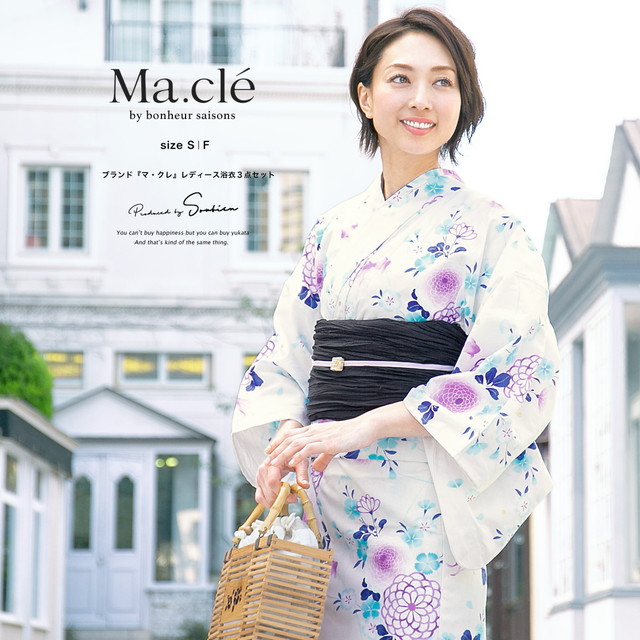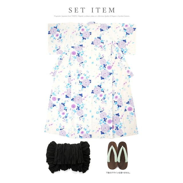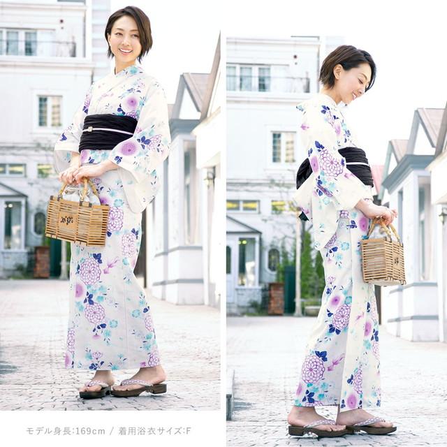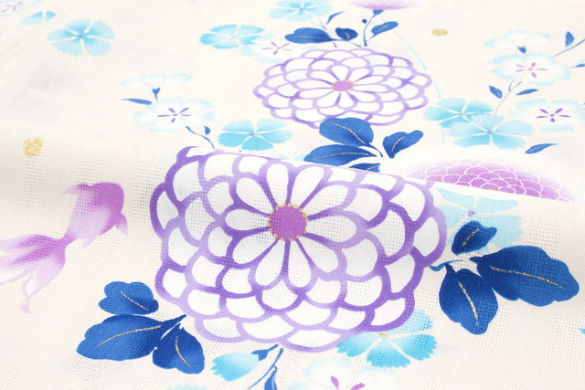 即納【レディース浴衣3点セット】浴衣セット/レディース/白/薄紫色/菊/金魚/撫子/ラメ/綿/女性/マクレ/ボヌールセゾン/S/フリー/大人/送料無料
