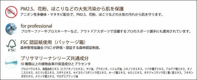 アロエペラエキス、海藻由来エキス(ヒラアオノリエキス)、ヤシ油、プラセンタ、ハトムギ油、ユキノシタエキス、ツバキ種子エキスなど