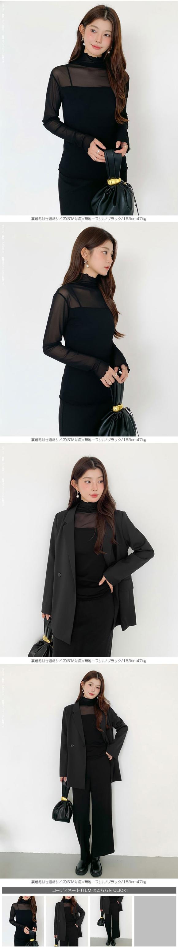 【シアートップス 】 透け感が魅力の「シアートップス」は、 洗練されたデザインで特別な日を華やかに演出します。 裏起毛効果付きなので、肌寒い季節でも心地よく着用でき、 長袖でも軽やかな印象を与えます。 ハイネック仕様が上品さをプラスし、 どんなコーディネートにも合わせやすい一着です。 |