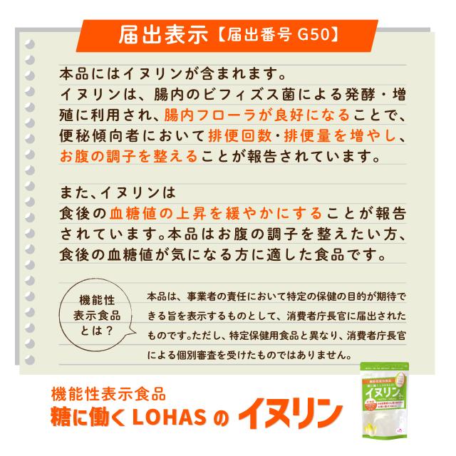 届出表示【届出番号 F939】本品にはイヌリンが含まれます。 イヌリンは、腸内のビフィズス菌による発酵・増殖に利用され、腸内フローラが良好になることで、便秘傾向者において排便回数・排便量を増やし、おなかの調子を整えることが報告されています。 また、イヌリンは食後の血糖値の上昇を緩やかにすることが報告されています。 本品はおなかの調子を整えたい方、食後の血統リが気になる方に適した食品です。■機能性表示食品とは?本品は、事業者の責任において特定の保健の目的が期待できる旨を表示するものとして、消費者庁長官に届出されたものです。 ただし、特定保健用食品と異なり、消費者庁長官による個別審査を受けたものではありません。特別なイヌリン「イヌリア」の取り扱い始めました!