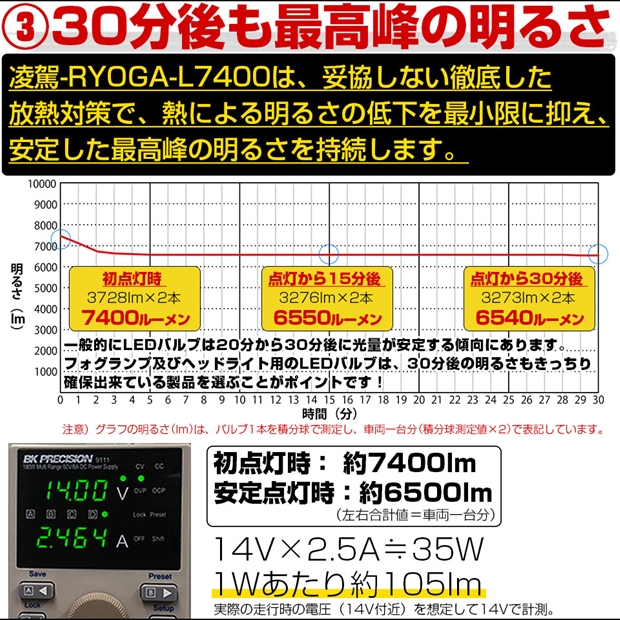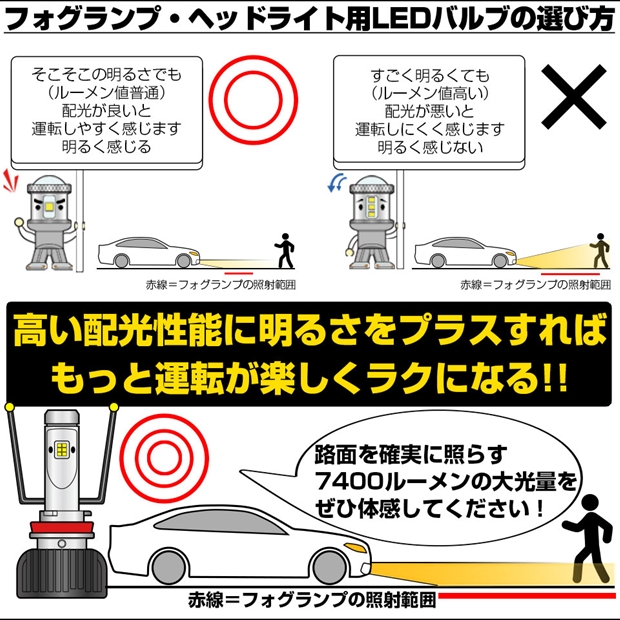 7400ルーメンの明るさに抜群の配光特性を兼ね備えたピカキュウLEDフォグランプ凌駕シリーズです。 他車へ幻惑を与えない正確な配光を生み出し、より広範囲な配光で路面を確実に照らす高い路面照射精度を実現しました。 妥協ない徹底した放熱対策により、熱による明るさの低下を最小限に抑え、点灯30分経過後も初点灯の約90%以上の明るさ保持します。 より快適でより安全な夜間走行をサポートします。この明るさ、ぜひ体感してください。