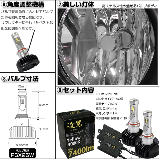 ピカキュウ,LEDフォグ,RYOGA L7400 FOG LAMP KIT,凌駕 L7400 フォグ,りょうが,爆光,配光性能高い,7400lm,イエロー,3000K,超爆光,明るい,汎用,ポン付け,後付け,車検対応,キット,国産車,日本製の車,