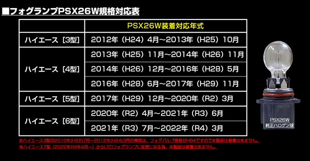 ◆ハイエース[200系 3型]の2010(H22)年7月〜2012(H24)年3月の車両は、フォグバルブ規格がHB4ですので本製品は装着出来ません。