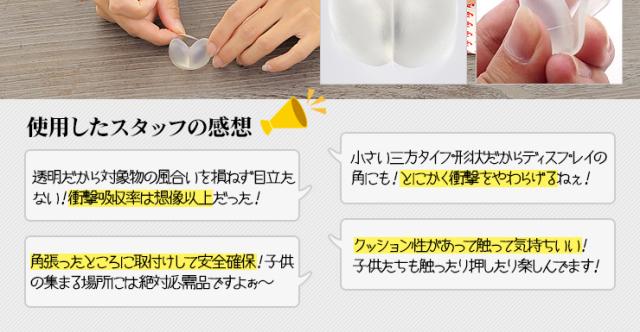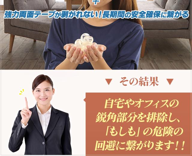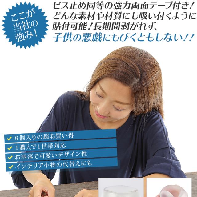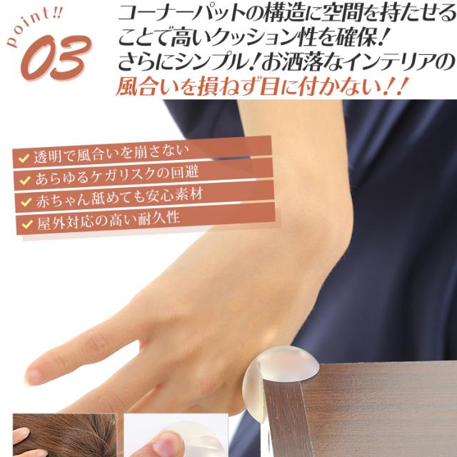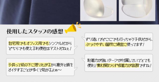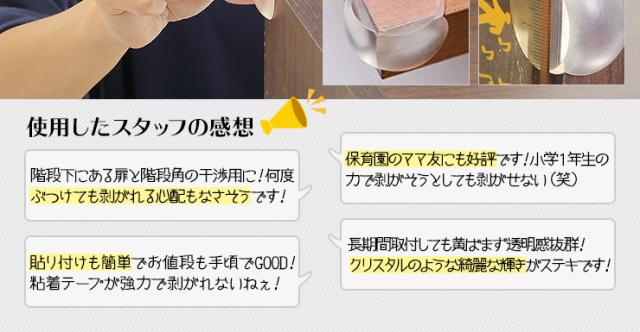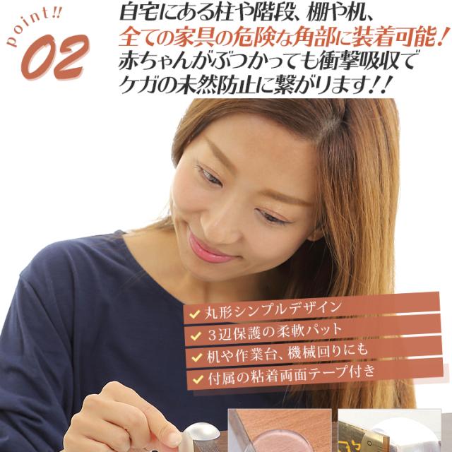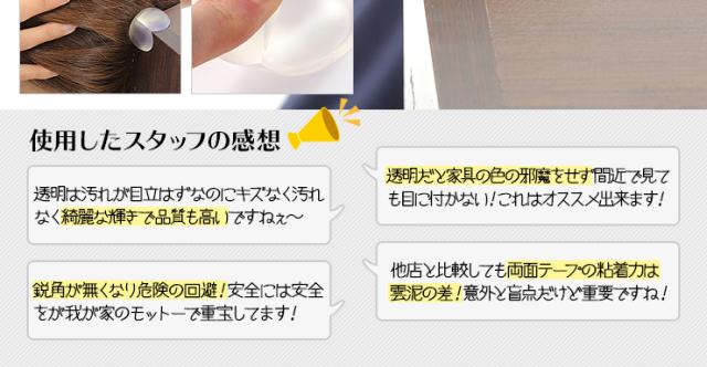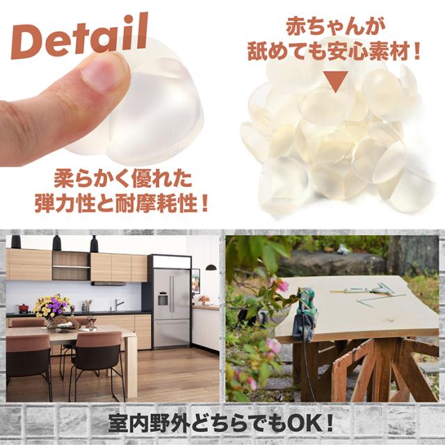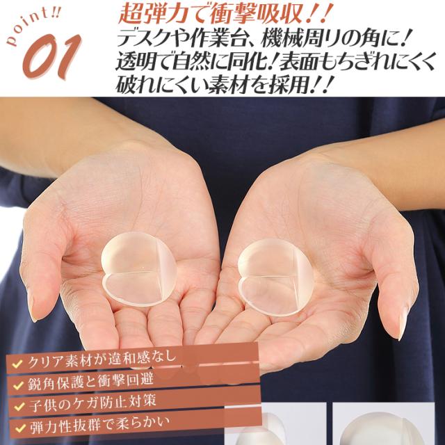(素材)ポリ塩化ビニル(PVC)。PVCは、柔軟で弾力があり、衝撃に強いのが特徴です。また、汚れも拭き取るだけで綺麗に払拭出来ます。耐久性や耐疲労性、耐燃性も優れております。 (デザイン・カラー)無色透明タイプ。丸型。透明でシンプルなデザインは、家具の美観を損ねることなくお使いいただけます。粋でスタイリッシュなデザインをお求めの方には、是非オススメです。(サイズ・セット数)高さ:約2.5cm 幅:約2.5cm 上底部:直径約3cm 内角:約2cm。一般的な家具や机の鋭角に「ピッタリ」と取り付けられます。(※取付箇所の高さや幅に関わらず、角であるならば、高さ違い、幅違いも全てカバー致します。)1商品=8個入り。意外と必要な取り付け箇所は多いものです。1回で使い切らなくとも予備としても保管出来ます。大変お買い得な商品です。(特徴)商品は、柔軟性と弾力性に優れおります。赤ちゃんや子供が頭や身体をぶつけても怪我や思わぬ事故の未然防止に役立ちます。粘着テープも付属します。