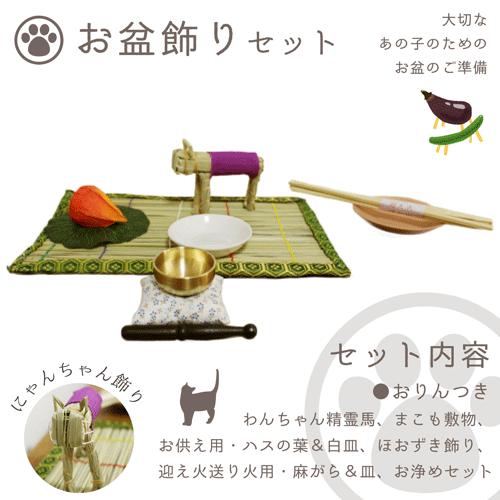 【 ペット仏具 】【 お盆 】 お盆飾りセット にゃんちゃん精霊馬 & おりん こりん お清めセットつき 本格的 迎え火 送り火 戸外用 盆用品 墓参用品 初盆 新盆