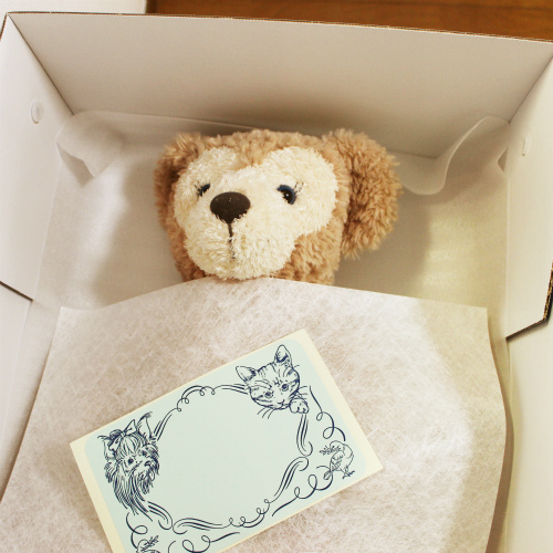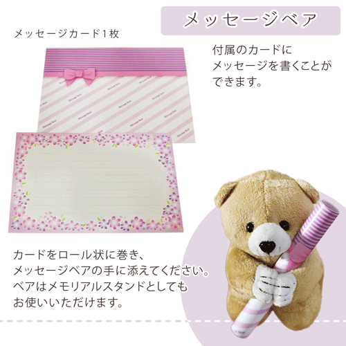 メッセージベアつき(筒状に巻いたメッセージカードを抱くことができます) / ぬいぐるみ(火葬)について:葬儀場によりぬいぐるみを含めペットちゃんと一緒に送り出すことができるものが違います。ご担当者様の指示に従ってください。