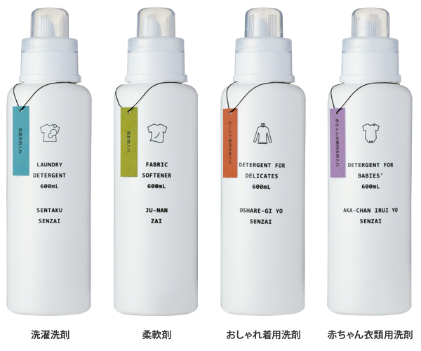 「洗濯洗剤」「柔軟剤」「おしゃれ着用洗剤」「赤ちゃん衣類用洗剤」の4種類があり、それぞれの用途で、描かれているイラストと文字が違います。