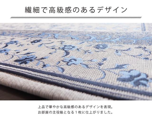 涼し気な印象の上品なカラーとデザインの花柄ラグ。